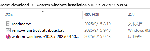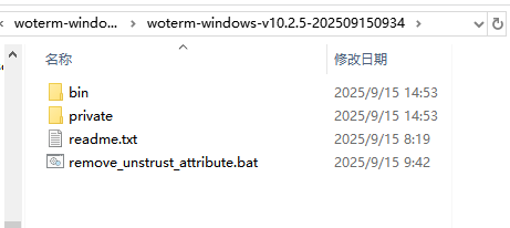 The installation package or portable package downloaded from the official website, after being extracted, yields the following file structures. Since it was downloaded from the internet, the system marks it as untrusted. As a result, during installation or when running the application, the system will block it and warn that it poses a risk.